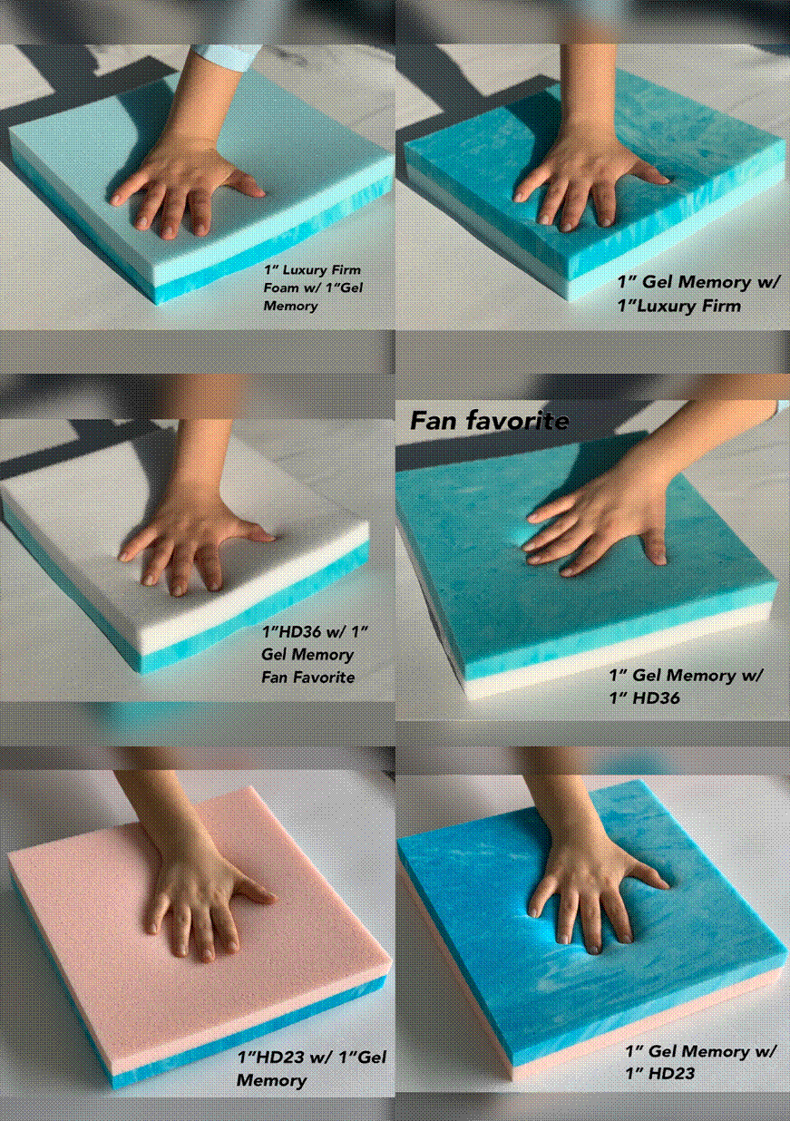 There are 5 different types of firmnesses to choose from: * 1” Thick Gel Memory Foam 4LBS with 1" Extra Firm Super Luxury Foam * 1” Thick Gel Memory Foam 4LBS with 1" Firm Luxury Foam * 1” Thick Gel Memory Foam 4LBS with 1" Medium Premium Foam * 1” Thick Gel Memory Foam 4LBS with 1" Extra Hd23 Soft Foam * 1” Thick Gel Memory Foam 4LBS with 1" Dry Fast Foam